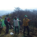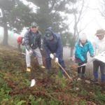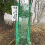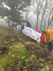 行事としては、綿向山の日 11月10日に頂上で植樹を行い、またもう一つの催しとして日野町のわたむきホールで「綿向山とくらす」として綿向山に関する展示を行うこととなり、この10日に関係者が参加するなか、綿向山頂上にて構成団体の代表者による植樹が行われました。当日はガスがかかり強風の中でしたが参加者全員の協力で無事終えることができました。今回は、登山道閉鎖中ということもあり関係者のみでしたが、この植樹は、綿向山の自然保護・保全活動の一環として頂上付近の食害などによる荒地化を復元する活動で、今後も持続的に実施していくものです。登山道再開後には多くの人の協力を得て進めていく計画です。多くの皆様のご支援、ご協力をお願いします。